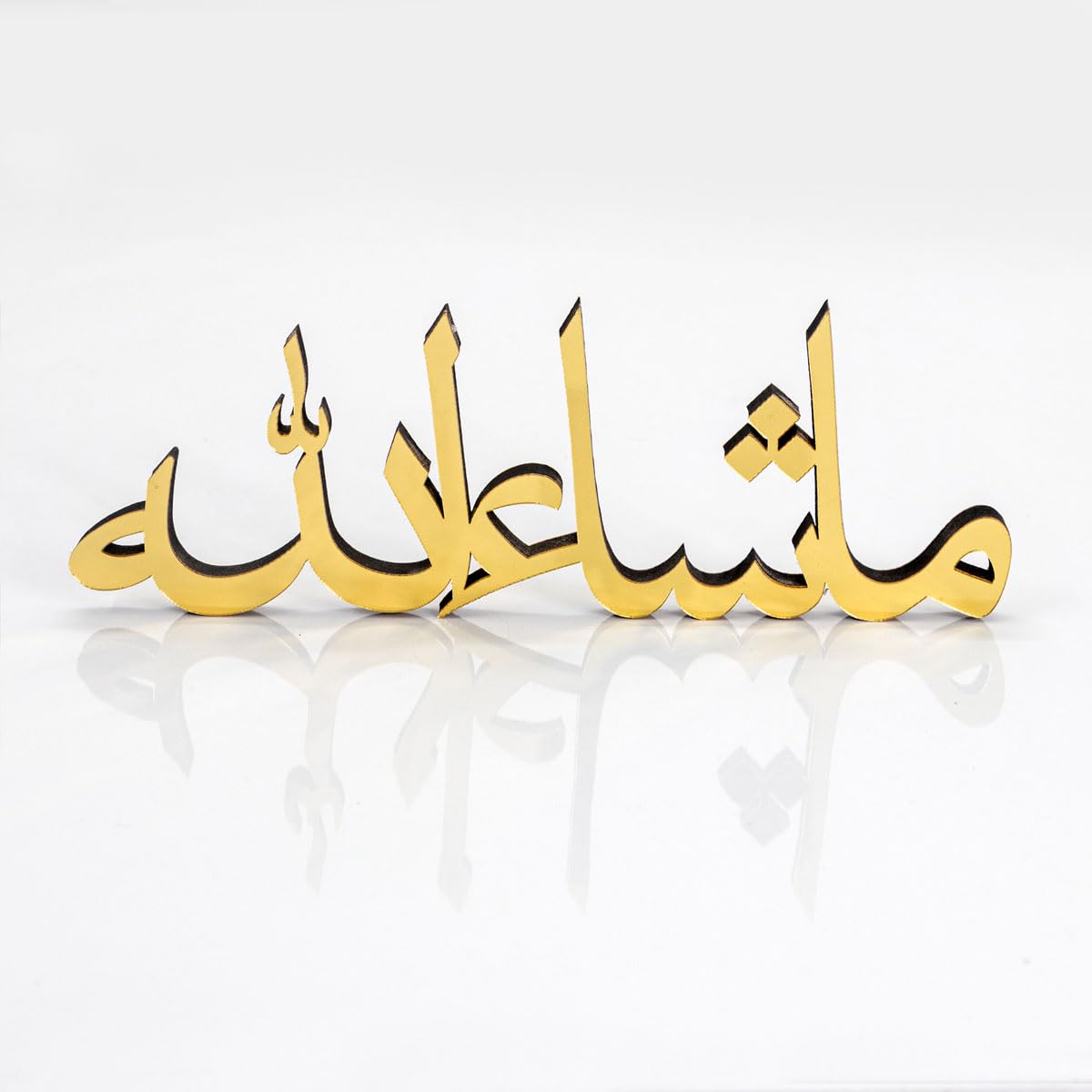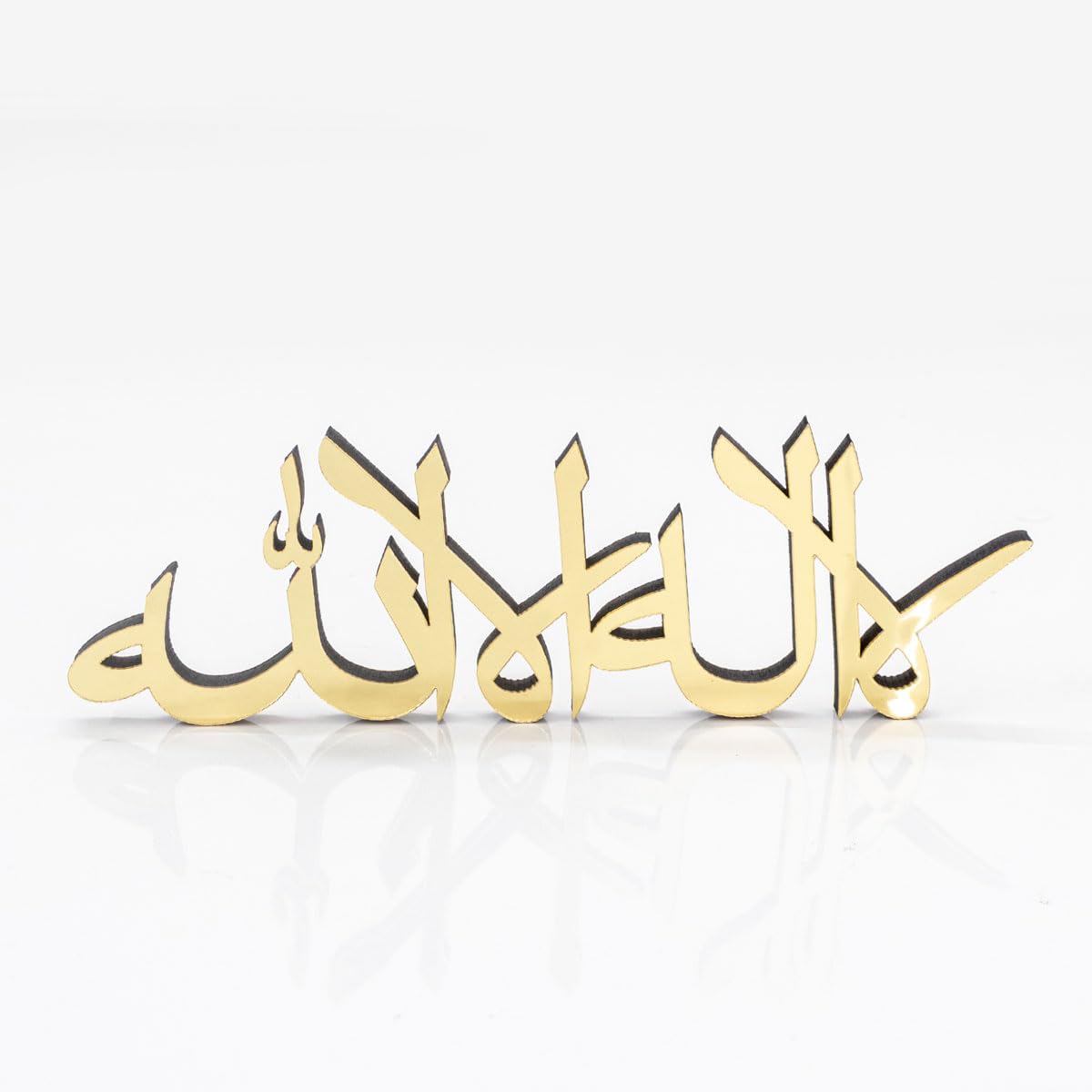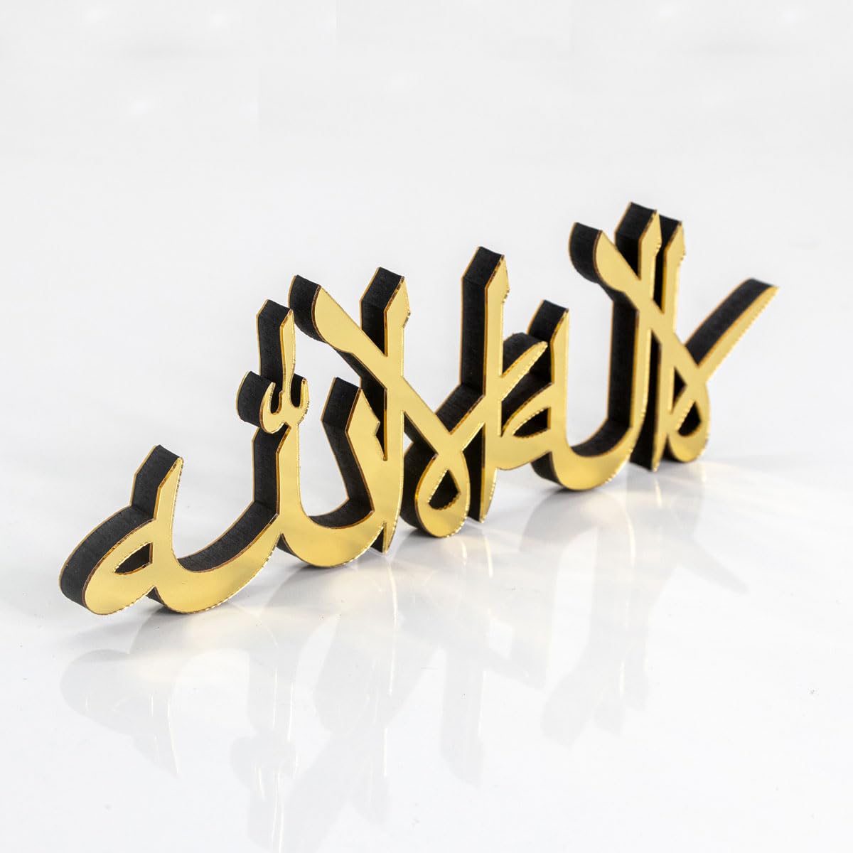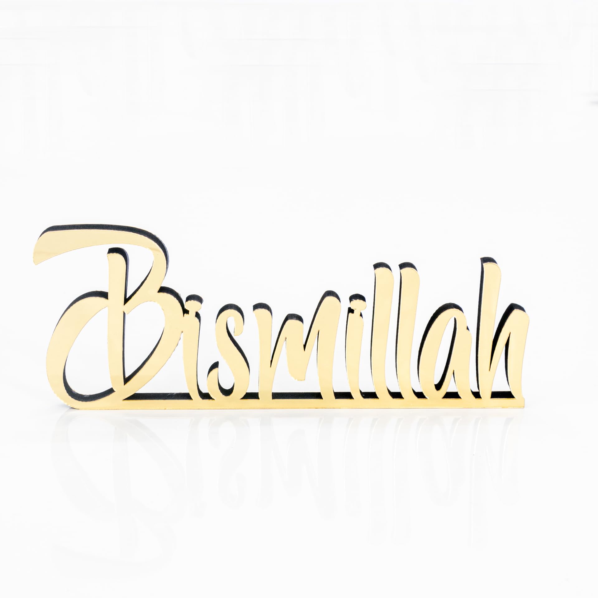 Details: Spruce up your table, desk, or shelf with this handcrafted freestanding 3D table decorations. 12,8"L x 3,2"H x 0.44"D Beautiful matte black or shiny acrylic finish Slight welding imperfections may occur but not recognised easily. Larger or smaller options can be created. Perfect Eid or Home Gift for Muslim friends. Cleaning Instructions: Please clean with a dry and soft cloth. Never wipe with a wet cloth using water, alcohol, or any other chemical liquids. Since it has a very glossy surface, it is recommended not to touch the front surface to prevent fingerprints.