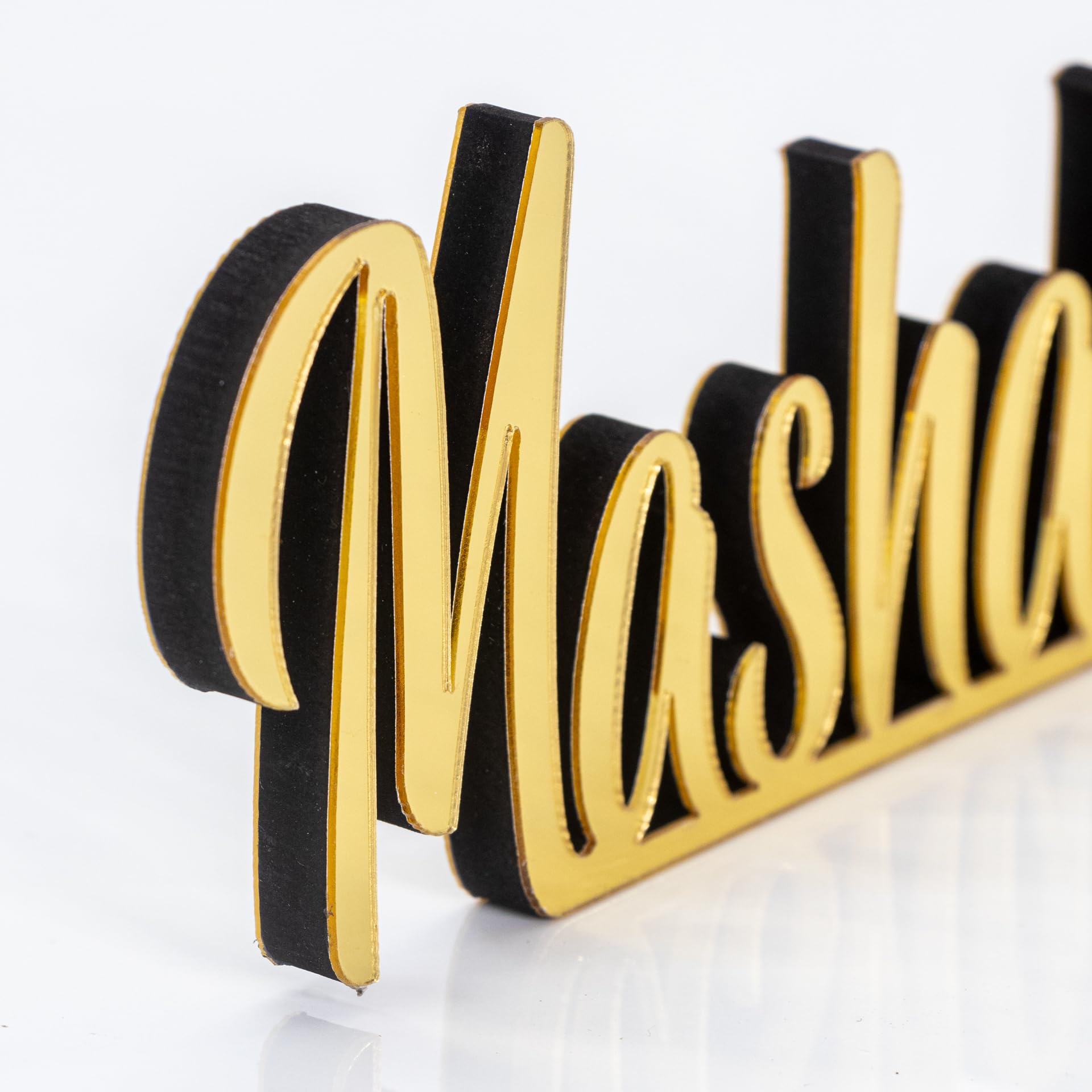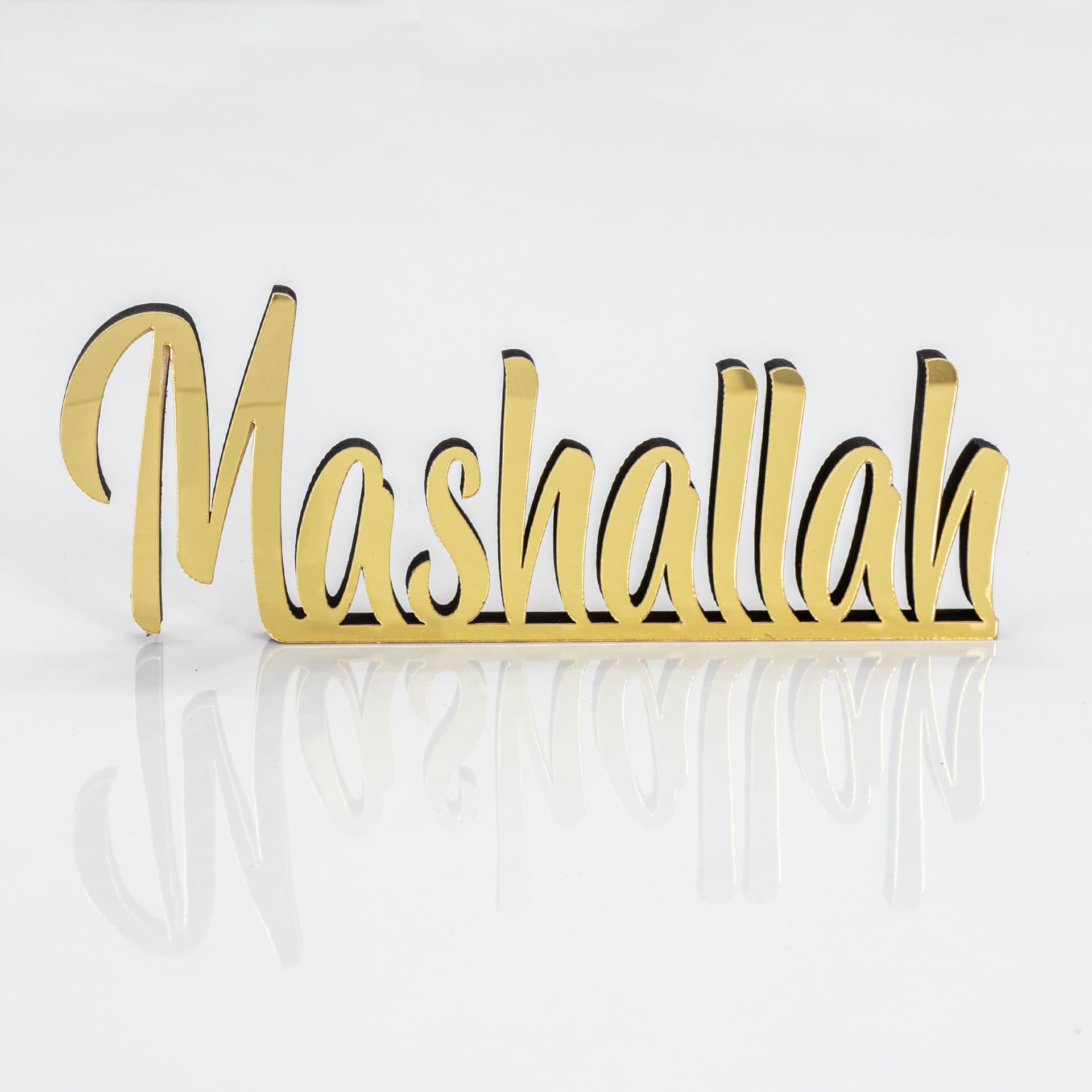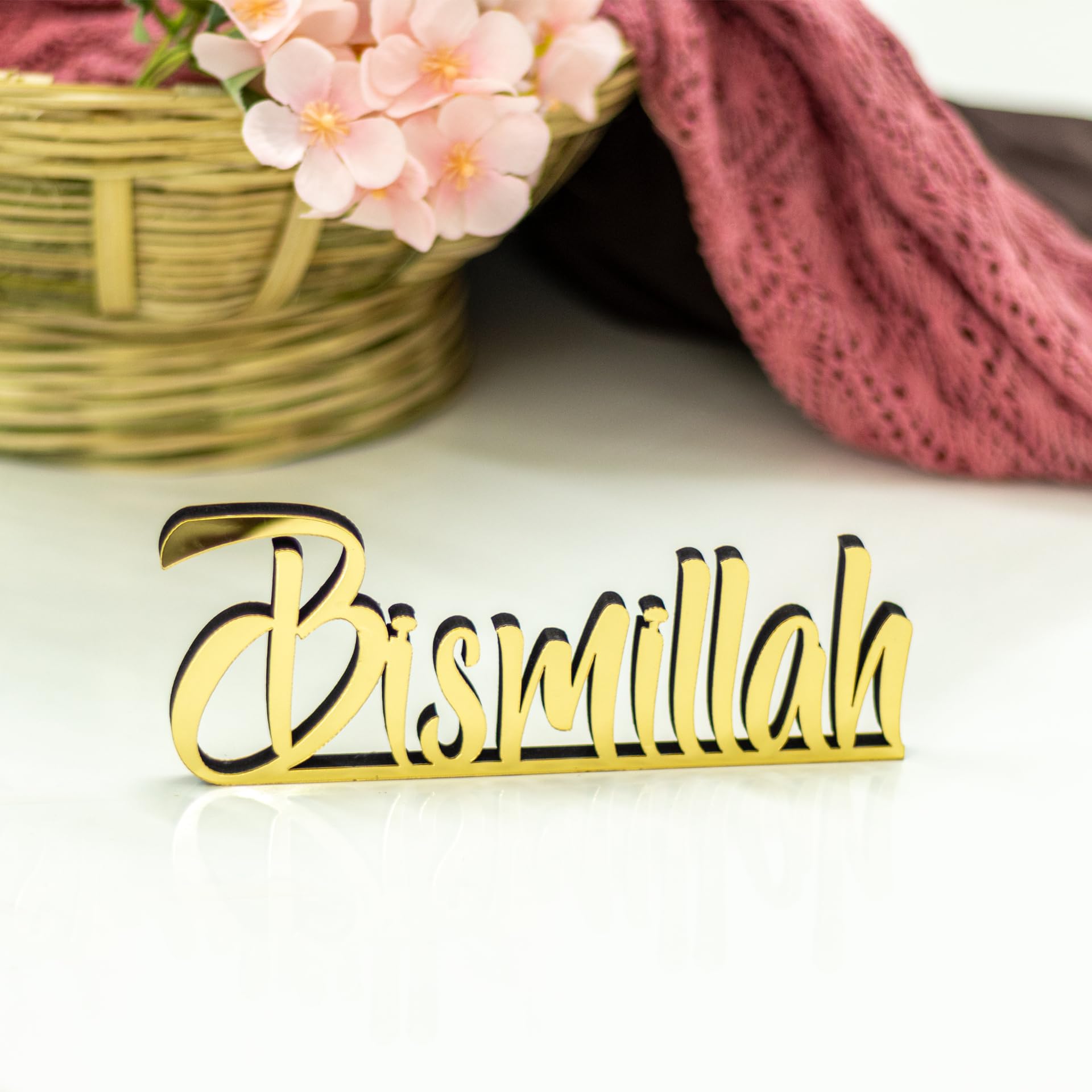 Details: Spruce up your table, desk, or shelf with this handcrafted freestanding 3D table decorations. 12,8"L x 3,2"H x 0.44"D Beautiful matte black or shiny acrylic finish Slight welding imperfections may occur but not recognised easily. Larger or smaller options can be created. Perfect Eid or Home Gift for Muslim friends. Cleaning Instructions: Please clean with a dry and soft cloth. Never wipe with a wet cloth using water, alcohol, or any other chemical liquids. Since it has a very glossy surface, it is recommended not to touch the front surface to prevent fingerprints.