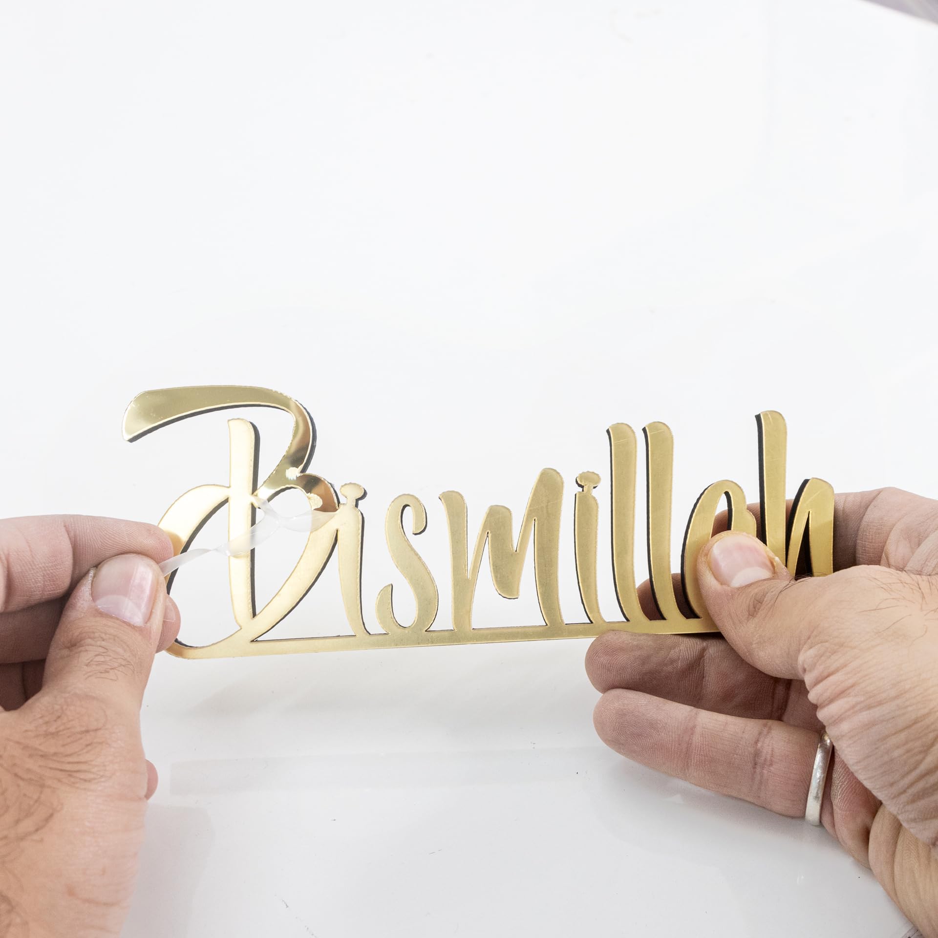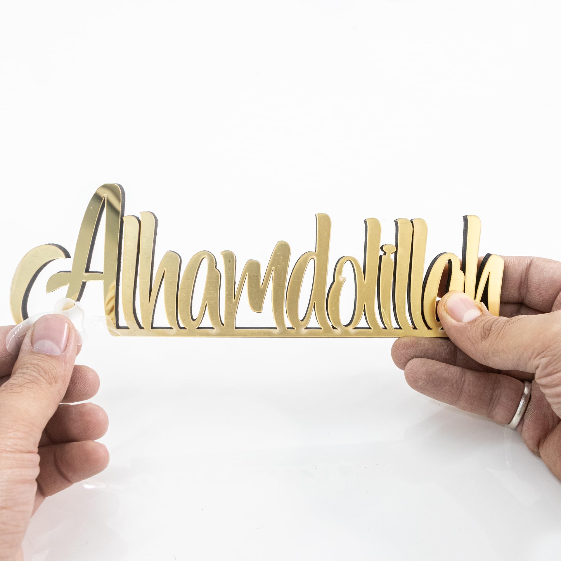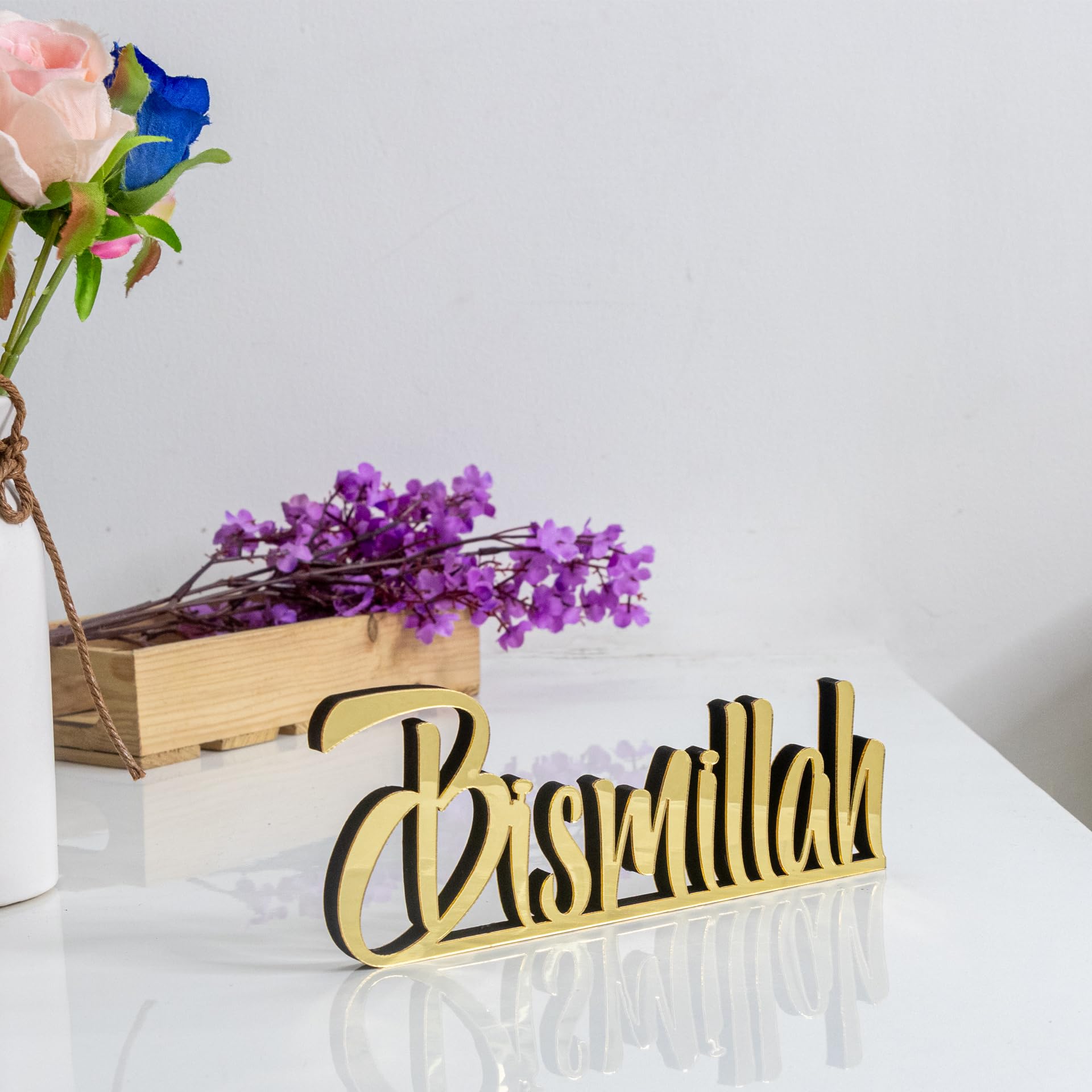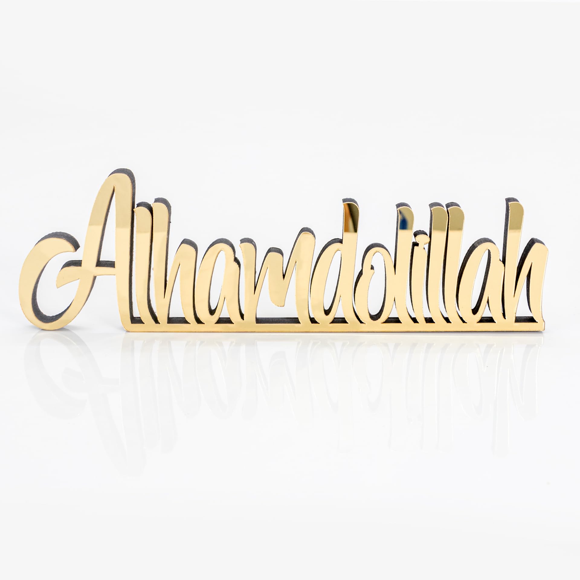 Details: Spruce up your table, desk, or shelf with this handcrafted freestanding 3D table decorations. 12,8"L x 3,2"H x 0.44"D Beautiful matte black or shiny acrylic finish Slight welding imperfections may occur but not recognised easily. Larger or smaller options can be created. Perfect Eid or Home Gift for Muslim friends. Cleaning Instructions: Please clean with a dry and soft cloth. Never wipe with a wet cloth using water, alcohol, or any other chemical liquids. Since it has a very glossy surface, it is recommended not to touch the front surface to prevent fingerprints.
